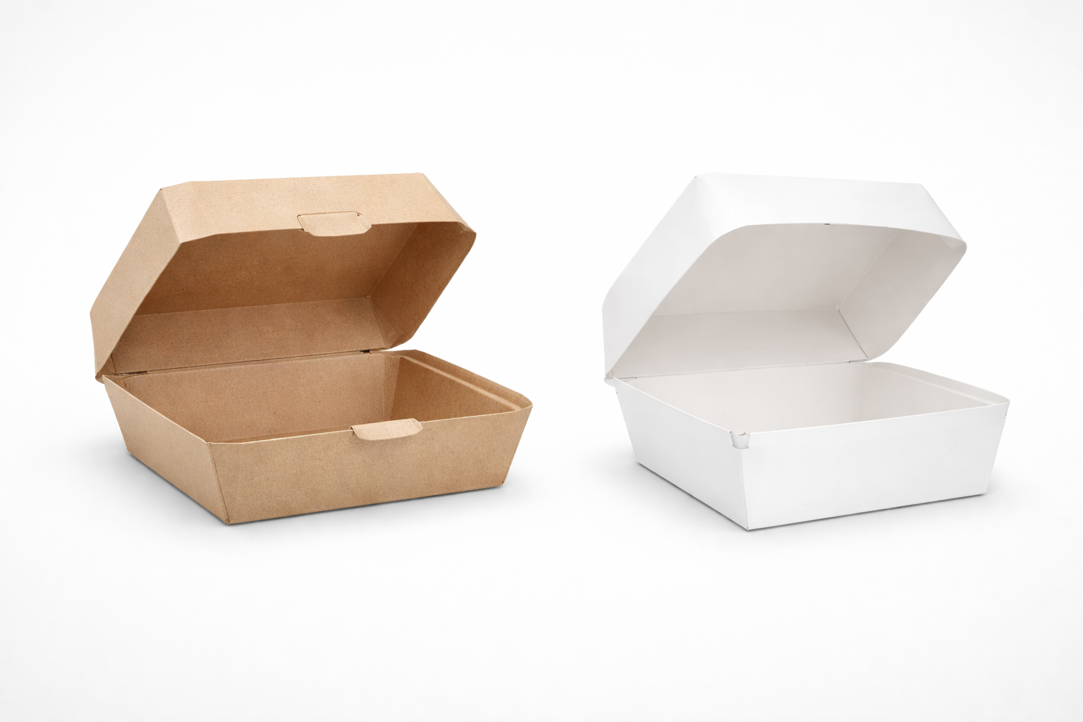 Premium food-grade cardboard clamshell packaging for food service brands.